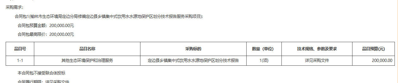 | 1-1 | 其他生态环境保护和治理服务 | 定边县乡镇集中式饮用水水源地保护区划分技术报告 | 1(项) | 详见采购文件 | 200,000.00 |