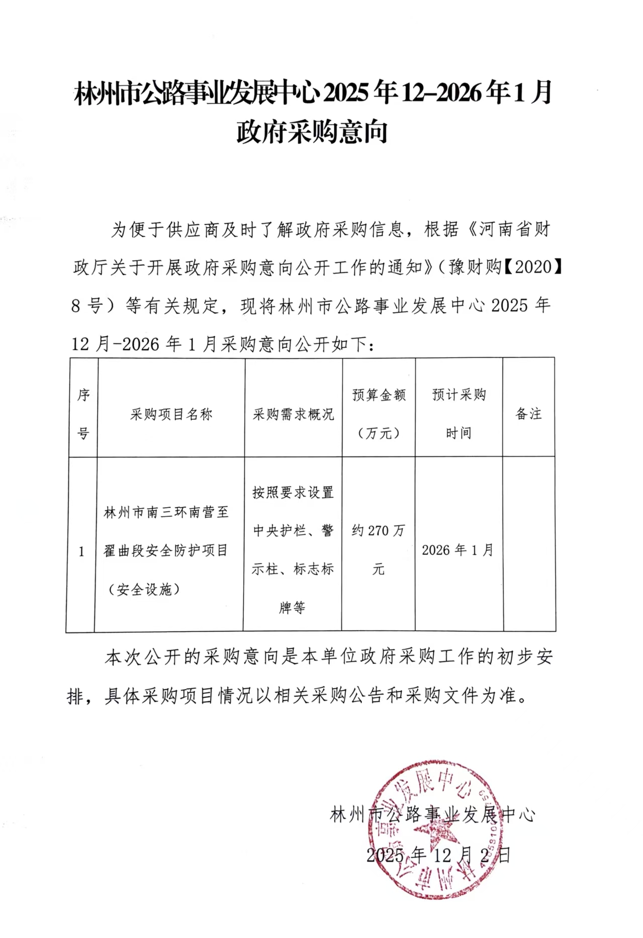 为便于供应商及时了解政府采购信息,根据《河南省财政厅关于开展政府采购意向公开工作的通知》(豫财购〔2020〕8号)等有关规定,现将林州市公路事业发展中心 2026年1(至)1月采购意向公开如下: