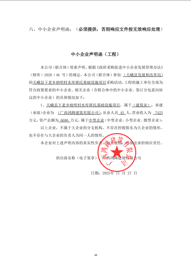 | 1 | 天峨县下老乡纳明村水库移民基础设施项目 | 天峨县下老乡纳明村水库移民基础设施项目 | 天峨县下老乡纳明村水库移民基础设施项目工程,主要建设内容:道路总长8223.00m,路面总建筑面积为27332.00㎡,路面宽度为3.5m、3m,道路基层为10cm厚碎石调平层,道路面层为18cm厚C25砼,安装800mm圆涵管186m。具体内容详见工程量清单及图纸 | 150日历天 | 杨勇文 | 市政公用工程二级建造师,桂******0397 |